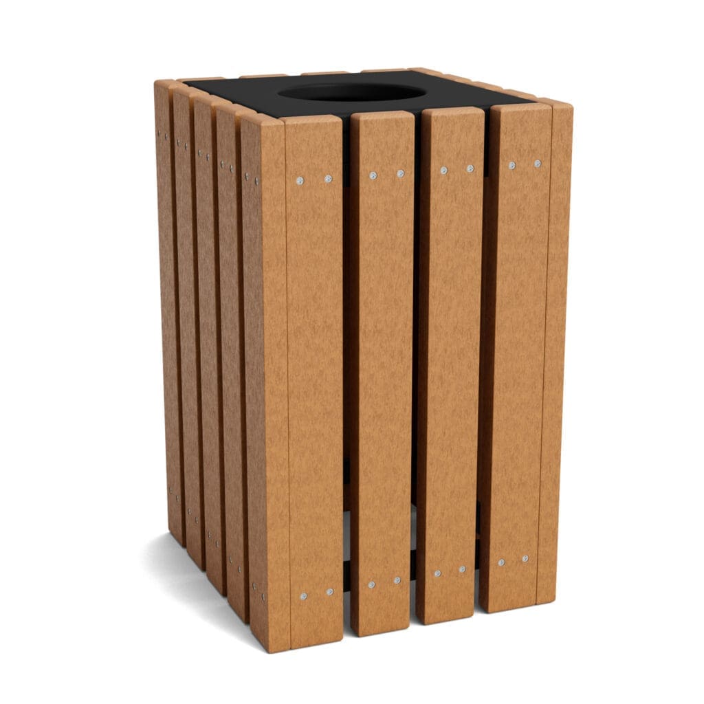 All of our trash receptacles are made of 100% recycled #2 plastic, the strongest of the plastic resins. Even the interior frames are recycled plastic, so a rusting, rotting frame falling apart will never be an issue. Our commercial receptacles will look great for years and years with occasional washing. In fact, they’ll look so good that they’ll make you look good, too!